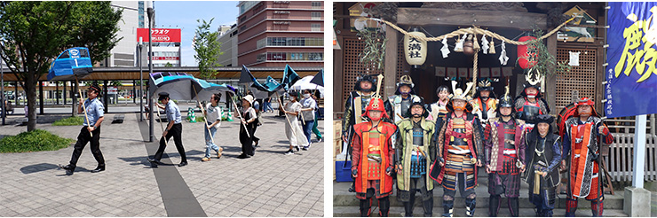 7月23日(日)に、サービスラーニング活動の一環として、「第25回大分西新町通り天神さま夢通り」という夏祭りイベントの運営に26名の学生が参加しました。このイベントでは、本学の藤原研究室の学生が、西新町通りの各所を巡って歴史を学ぶスタンプラリーやヨーヨー釣り、折り紙体験のワークショップの企画運営を行うとともに、JR九州大分駅の皆さんと一緒に「どこでも駅」の担ぎ物をもって市内を練り歩きました。また、学生1名が武者甲冑を着用し、豊後大友宗麟鉄砲隊の皆さんの行列に加わりました。