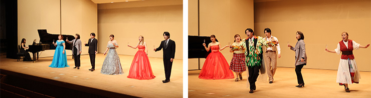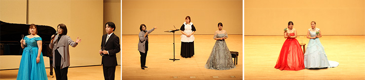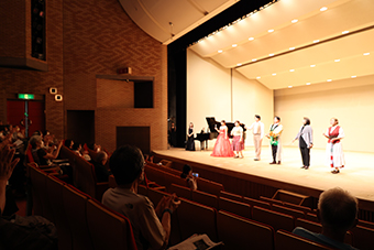 当日は愛甲先生より、オペラの場面や作曲者、演者の役割などの解説があり、声楽コース学生による6曲を披露しました。来場者は解説を聞きながら学生の歌声に耳を傾け、細かな演技やステージ外からの演出に感嘆の声をあげ、オペラを楽しみました。