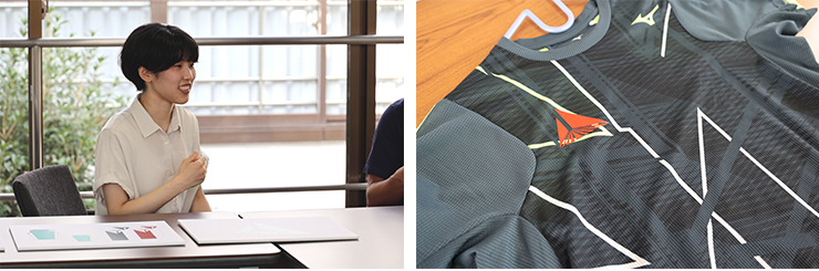 写真:取材を受ける草野さんと、実際にユニフォームにあしらわれた新しいデザイン