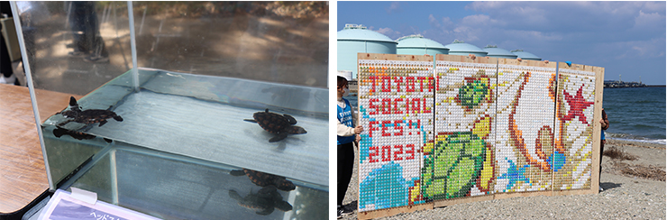 活動では、はじめにNPO法人おおいた環境保全フォーラムの内田桂氏から「ウミガメの生態に関する講義」があり、その後、情報コミュニケーション学科の綾部誠准教授および藤原ゼミの学生が「別府湾の海岸における漂着物の特徴と課題」と題してミニ講義を行いました。その後は、日本文理大学の皆さんの運営によってビーチクリーニング、ペットボトルキャップアート作りを実施しました。