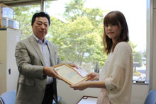 先日、本学HPでお知らせした、本学 情報コミュニケーション学科1年の工藤明日香さんが「JFN学生ラジオCMコンテスト」でブロック賞を受賞したことをうけ、エフエム大分本社にて表彰式が行われました。