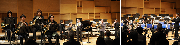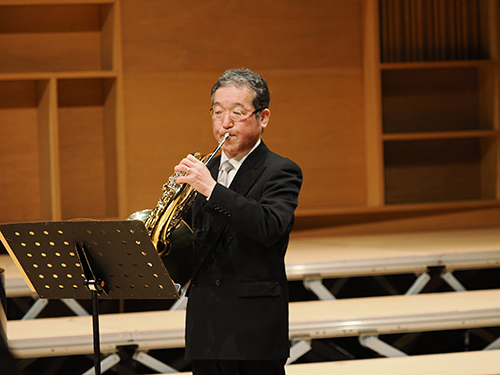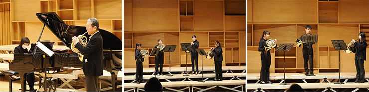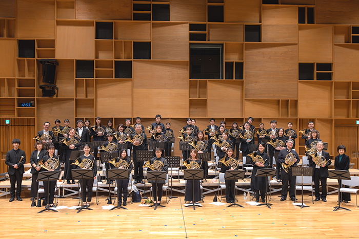 当日はホルンを学ぶ在学生のほか、県内外でホルン奏者として活躍する卒業生や特別ゲストをお招きし、ホルンを主体とした独奏・アンサンブルなど計8曲を演奏しました。また、40名以上のホルン奏者による大規模アンサンブルでは清水教授自ら指揮を執り、来場者はその迫力ある演奏に圧倒されました。