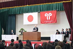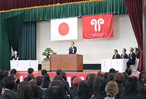 小手川大助学長が式辞で「失敗を恐れずに地域社会に出て行って挑戦を繰り返し、最高に中身の詰まった二年間としてください」と新入生を激励し、短大と専攻科それぞれの入学生代表が「学則を堅く守り、学生としての本分をつくす」ことを宣誓しました。