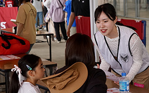 学生スタッフとして参加した学生は、各ブースの担当者からレクチャーを受けながら、横浜キヤノンイーグルスのSNSキャンペーンや来場ラリーに関する広報活動、また、来場者への大分県産ひまわりのプレゼントやネイルシール体験コーナーといったスタジアム運営のサポートを行いました。県内外から来場したお客様一人ひとりに声かけを行い、試合会場の雰囲気を一層高めることに頑張っていました。