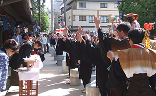現在5月3日、4日の「博多どんたく」の中で行われている「松囃子・まつばやし」は、本来、小正月(旧正月15日)の行事で、新しい年に祝福をもたらす歳神を迎える民俗行事が芸能化したものです。かつては日本全国(大分市でも)で行われていた行事でしたが、現在は唯一、博多のみで行われています。
