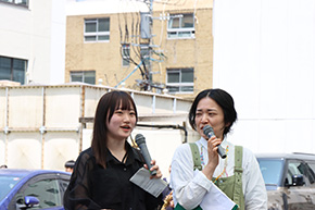 完成式典では、プロジェクトに関わった学生を代表して、この3月に情報コミュニケーション学科を卒業した冨山菜々さんが、これまでの作成の経緯、歩道・車道・地上機のデザインに込めたそれぞれの願い、これからの商店街活性化に対する期待などについて発表を行いました。式典には多くの市民や関係者が参加し、完成を祝いました。