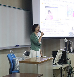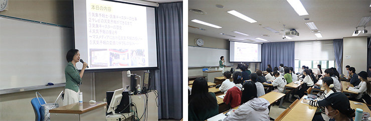 5月31日(金)2限の共通教育科目「時事ニュース研究」では、日本テレビで活躍する気象予報士・藤森涼子さんが、「天気予報の変遷」をテーマに授業を行いました。
