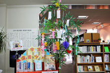 特設コーナーでは本の帯をリサイクルした短冊とペンを置いていますので、お願いごとを書いて笹につるしてみませんか?