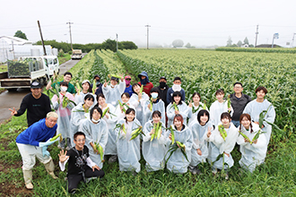 現地では朝8時半から卯野農園において、とうきび(とうもろこし)生産の歴史や苦労話などをお聞きし、貯蔵庫などを見学し、そのあとに全員でとうきびの収穫支援を行いました。