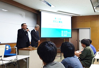 7月18日には、共通教育科目「文化と観光」において、長崎くんちの踊り町である八幡町の自治会長・橋本清氏と、八幡町奉賛会長・松尾正造氏の特別講義が行われました。