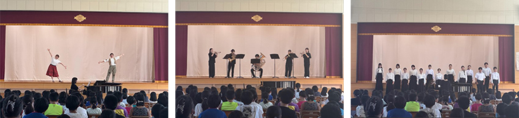 本学音楽科、専攻科音楽専攻の学生たちが、オペラハイライト、ピアノソロ、弦楽アンサンブル、木管五重奏、金管五重奏、合唱などを披露しました。また、最後には児童・生徒の皆さんと一緒に校歌を歌いました。