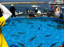 このプロジェクトは、本学のサービスラーニングの一環です。今年は5月中旬、学生約30人が写真撮影を敢行。「夏祭り」には23人の学生が参加して写真撮影するほか、「はまちのつかみ取り大会」(写真)や「演芸大会」にも出演する予定です。島の皆さんのご好意で、学生らは海岸近くの空き家3軒に分宿して、2日かかりでの撮影に臨みます。