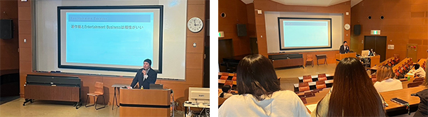 12月13日(金)の「情報リテラシーⅡ」(担当:情報コミュニケーション学科・野田准教授)において、合同会社ユー・エス・ジェイ法務部の福井秀明 氏に「Entertainment Business」についてご講演いただきました。授業で学んできた著作権がエンタメビジネスにどのように関わっているのかについて、テーマパークの事例に留まらず、ゲーム・漫画・アニメ・映画・VTuberに至るまで幅広い分野について解説していただきました。各分野における市場動向やマネタイズ、著作権との関係などを海外と比較しながら分かりやすくお話しいただくことで、学生たちは著作権などの知的財産権が身近なビジネスの中で活かされていることを実感でき、コンテンツ産業や権利に対する理解が深まりました。