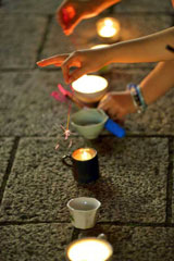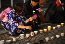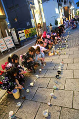 府内五番街「時計台」周辺にキャンドル約1000個を並べて、午後7時半に点灯。主催、後援団体代表の挨拶のほか、昨年の「ザビエルそっくりさん選手権」で優勝した佐藤祥司さん(大分市在住)も特別出演し、点灯式に彩りを添えました。