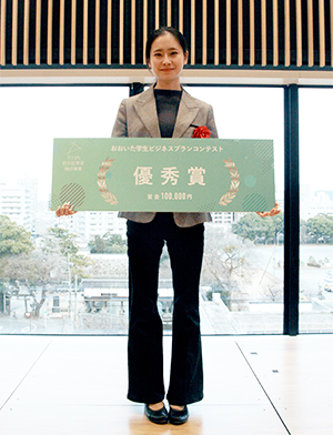 受賞者の有光さんからは、「この度は、優秀賞をいただくことができ、大変光栄に思っております。また、ビジネスプランコンテストに臨むにあたり、ご協力いただいた国際総合学科の先生方をはじめ全ての方々に感謝を申し上げます。大分県ならではの特徴に焦点を当てたビジネスプランではありましたが、他の地域でも応用して発展させることができるビジネスプランだと考えております。そのため、審査員の方々からいただいたコメントをもとに、ビジネスプランのさらなるブラッシュアップを重ねていきたいと思います」とのコメントがありました。