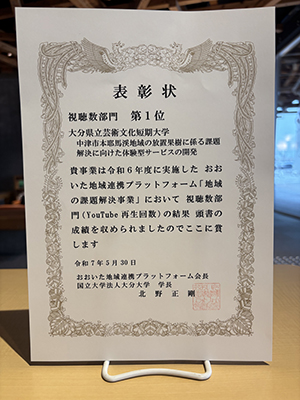 国際総合学科「経営学研究室(担当:秋庭淳志講師)」の地域課題解決に向けた取り組みが、令和6年度おおいた地域連携プラットフォーム「地域の課題解決事業」において、視聴数部門で第1位となり、表彰されました。同事業は、大分県内の大学・短期大学等の教員が企画し、学生とともに地域課題等の解決を図る事業です。令和6年度は各大学等が事業成果をまとめた29本の動画をYouTubeで公開した結果、再生回数が最も多かった経営学研究室の事業が表彰を受けました。