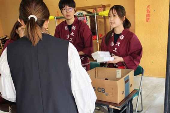 当日は、新大工町の地域の皆さまと共に、町事務所の設営や配布物の仕分けなどに従事し、地域が一体となって行事を支える様子を間近で体感しました。学生たちは、伝統行事の運営に直接関わることで、その文化的価値や地域に根ざした行事の意義を深く学ぶことができたようです。