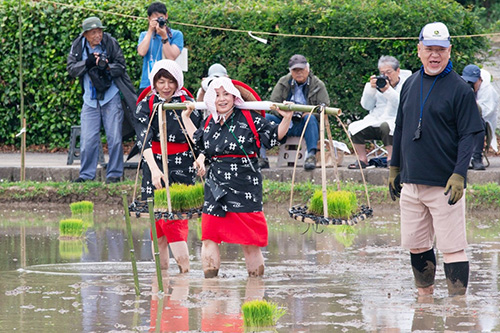 学生たちは、宇佐神宮神職による神事の後、中世の装束を身にまとい、現代ではあまり見られなくなった手植えによる御田植を体験しました。泥にまみれながらも、伝統的な農作業を楽しむ貴重な一時となった様です。