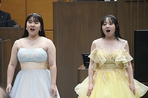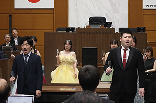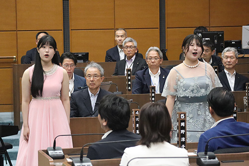 約30年ぶりに更新された県議会議場の運用開始を記念して、佐藤 樹一郎県知事をはじめ、多くの県議会議員が見守る中、本学の専攻科音楽専攻科生が議場にてコンサートを行いました。