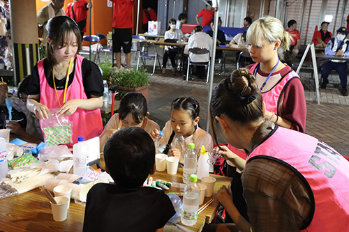 このイベントに参加するにあたり、5月13日(火)に地域社会特講Ⅰにおいて鶴崎の歴史や祭事に関する講義を頂き、3つのグループに分かれてそれぞれ準備を進めてきました。今回が最後となる「国道1BAN」では、会場設置、選手の誘導、受付などの業務にあたりました。大分県立芸術文化短期大学が主催するワークショップでは、小学生低学年以下を対象としてスライムとエコキャップの作成を行いました。「全力〇〇」では、イベントのパネル作成、イベントの事前準備、受付、参加者の誘導などを支援しました。