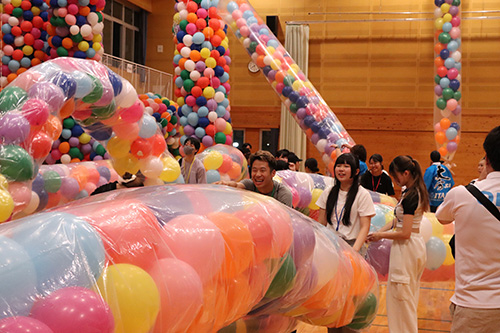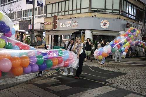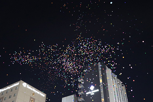イベント当日に旧荷揚町小学校の体育館に集合し、風船にヘリウムガスを入れ、1つ1つに紐を結ぶ作業を担当しました。午後7時半には団結式が行われ、ガスを入れた風船をJR大分駅前の大通りに移動させ、市民の方々に1つずつ配って回りました。午後8時半からは中央通りでDRUM TAOの皆さんによるイベントが始まり、午後9時に準備した風船を暑い夏の夜空に一斉に解き放ち、参加された20万人近くの大分市民および観光客の皆様に、思い出に残る夜のひと時を喜んで頂きました。イベント終了後はDRUM TAOの皆さんも一緒に、記念写真を撮影しました。
