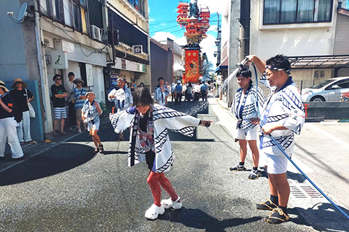 学生たちは、日田市商工会議所と若宮町さんのご協力のもと法被を着用し、山鉾の曳き手、押し手として、実際に巡行行事の一部に参加させていただきました。