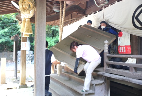 弥栄神社所蔵「素戔嗚尊八岐大蛇退治図絵馬」の取り外し作業と調査を実施しました