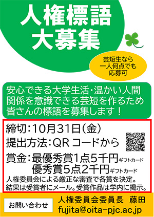 人権侵害防止委員会では、安心できる大学生活・温かい人間関係を意識できる芸短大を作るために、在学生の皆さんの人権標語を募集します。以下のURLのGoogleフォームから、ご応募ください。学内にちらしも掲示していますので、ご覧ください。