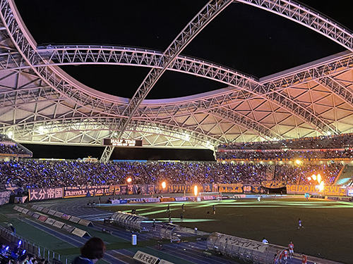 当日は22名の学生が参加し、西口・東口に分かれて販売から貼付までを担当しました。大分トリニータは5月31日(土)以来の勝利がなく厳しい状況でしたが、この日は仮面ライダーとのコラボ企画「亀祭」が開催され、17,087人もの来場者で大変盛り上がりました。試合は前半に先制点を挙げるも追加点がなかなか奪えず、緊張感の続く展開となりましたが、最終的に勝利を収め、私たちの活動もスタジアムの盛り上げに貢献できました。