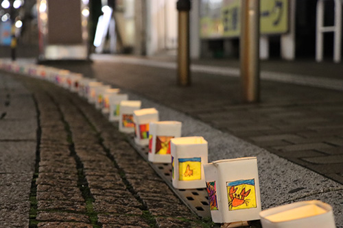 当日は午後1時から、子供向けのワークショップとしてプラバン、エコキャップ、プルタブを使ったネックレスの作成が行われ、娯楽として射的、輪投げが行われました。またスタンプラリーも実施されました。これらのイベントには、非常に多くの親子連れの方々に参加を頂きました。また午後5時からは、大分市内の幼稚園・保育園・こども園の園児の皆さんに描いてもらった絵、約1,000枚を牛乳パックに巻いてキャンドルにして点灯しました。
