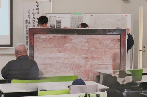 講演では、堤先生が研究を進めている大分市・上野の弥栄神社所蔵「府内祇園祭礼図絵馬」について、科学調査で得られた分析結果をはじめ、小字名や棟札、古文書、現存する神社の位置関係などを参照しながら、参加者の皆さんとともに照合作業が行われました。とくに、大絵馬の構図を読み解くうえで重要な鍵となる、本学に隣接する大臣塚古墳の石碑をはじめとした関連資料も紹介され、失われた都市祭礼の実像が徐々に明らかになっていきました。