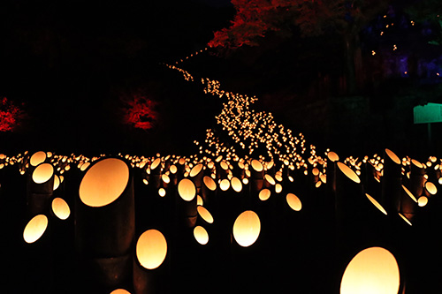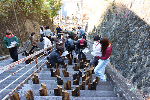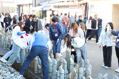 竹楽は大分県を代表する晩秋の風物詩となっており、市内各地に2万本の竹灯篭が設置され、多くの観光客が訪れる一大イベントになっています。事前に地域社会特講2の講義で、主催団体の代表者から里山保全の取り組みの一環としての「竹楽」の位置づけを学習した後、現地での活動に学生達が参加しました。
