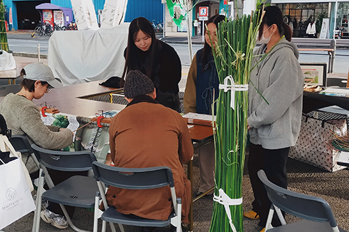 学生たちはイベントの一画をお借りし、近世府内の経済を支え、昭和30年代頃まで大分市内で生産されていた「七島藺」の文化的記憶を後世に残そうと、生産者の方々を対象に聞き取り調査を行いました。現在、七島藺は地理的表示保護制度(GI)に「くにさき七島藺表」として登録され、国東地方でのみ生産が行われています。