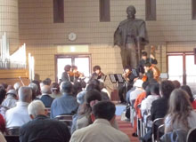 本学 音楽科 川瀬麻由美教授をはじめ、管弦打コースの学生が出演、モーツァルトの「アイネ・クライネ・ナハトムジークより第一楽章」、アンダーソンの「プリンク・プランク・プルンク」、「踊る猫」、滝廉太郎「花(モーツァルト風)」など、春らしい楽曲を披露しました。