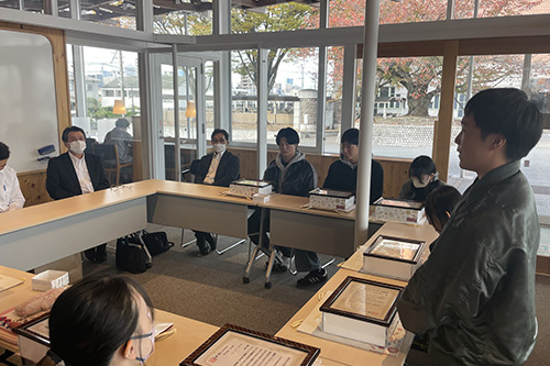 これまでの長期にわたるゼミ活動に関して謝意を直接学生に伝えるべく、11月17日(月)ガンジーファームを経営する㈱まるひでの小野社長をはじめとした役員の方々が来学、吉村ゼミの学生それぞれに感謝状と記念品の授与が行われました。
