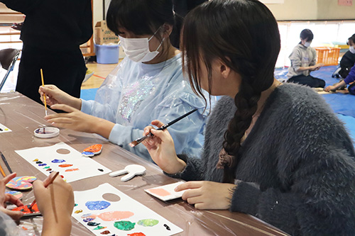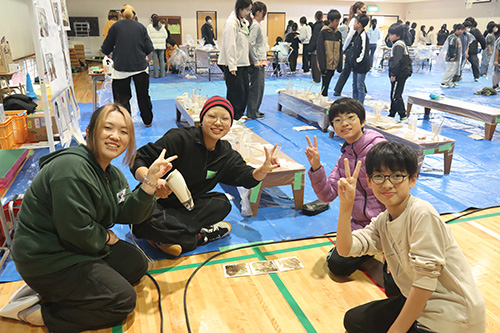 美術専攻の4分野に分かれ、それぞれの専門を活かしたワークショップを実施し、美術専攻1年生と、小学校5、6年生の児童ら47名が参加しました。
