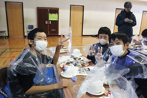 当日は、箔や日本画材を使った絵画、マグネット型キャンバスに油絵体験や粘土を使った造形活動、いろんな材料を使用したフェイクケーキ作りを行い、自由に制作しました。児童は普段とは違う画材に苦戦しつつも、学生のアドバイスを受け、楽しく個性あふれる作品を仕上げました。