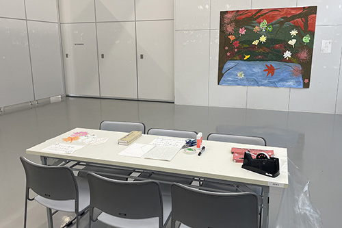 本展は、学生による作品公募展と参加型イベントを組み合わせた展覧会です。学生作品の展示に加え、来場者が一つの大きな風景作品に自由に色を加えていく参加型企画を取り入れています。参加型作品のテーマは「コスモス」と「紅葉」で、来場者はそれぞれの感性に基づき、思い思いの色を重ねていきました。学生公募には7点の作品が集まり、表現方法の異なる作品たちが一堂に会する展示となりました。