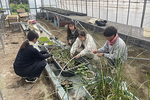 12月25日、国際総合学科の学生が、鹿児島大学教育学部の実習地において七島藺のサンプリング調査を実施しました。本調査は、国際総合学科・歴史観光学研究室が取り組むフィールドワーク支援事業の一環として行われたものです。