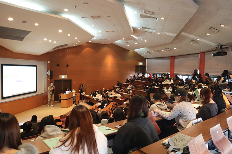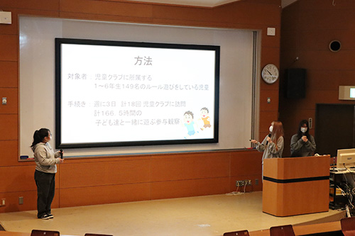 心理スポーツコース、地域活性コース、情報メディアコースの3コースから、12研究室、計44の研究内容について発表が行われました。この発表会は、1年間の研究成果を広く公表し、大学での学びの集大成の位置づけにあたります。会場には同学科1年生・2年生が参加し、発表後は活発な質疑応答が行われました。