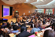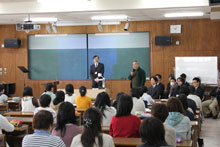 最初に、これから始まる学生生活についての心がまえや共通教育科目の履修方法、防犯講和、サークル紹介など全体的な説明を行った後、各学科に分かれました。