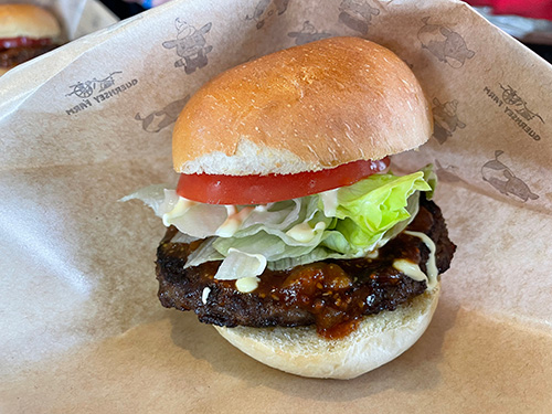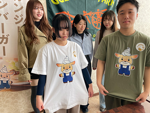 課題把握を行った学生による解決へのアプローチとして下記の2つに取り組んできました。一つ目のアプローチはZ世代に刺さる商品開発です。メンチカツにするか、ホットドックにするか、地元大分の食材を使ったディップを食べ比べるなど試食と検討を重ね、今回「ガンジー牛の雄牛」を使ったハンバーガーの商品化を実現しました。二つ目のアプローチは、ガンジーファーム、及びガンジー牛、新商品となるハンバーガーのブランディングや商品認知です。今回、「ファーム自体の認知」「ガンジー牛の魅力の認知」「新商品であるハンバーガーの認知」に向けた動画の制作、さらにあらゆるシーンで使えるようなガンジー牛の新キャラクターデザインを作成しました。ハンバーガーの包装紙をはじめ、商品ののぼり、ショップで販売するTシャツ、ボンボンドロップシールなど広く使えるようにしました。