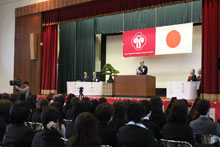 また、本式典にご参列下さいました皆さんのご家族、関係者の方々にも、心からお祝いを申し上げる次第です。九年の義務教育と三年の高校生活を終えて入学された皆さんは、十八歳、十九歳の方々でしょうが、中には実社会の経験を持ち、更に勉学を志した方もいらっしゃいます。こうして様々なキャリアを持った人達が同じ教室で机を並べるのが、本学のいいところです。