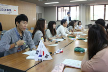 交流会では、国際総合学科2年の里谷真理子さんと川野祥子さんが韓国語で挨拶と学校紹介を行ってから、学生同士の意見交換会を行いました。ここでは、グループに分かれて会話をし、その後それらを発表する、という形をとりました。みなさん、趣味や好きな食べ物、好きな芸能人、スポーツといった若者らしい話題から、軍隊のことまで、とても盛り上がって話をしていました。学生たちは「韓国語を少しだけしゃべることができるので、いい勉強になりました。韓国の学生が、一生懸命日本語を使ってくれたのも嬉しかったです」「短い時間でしたが、いろんな話ができたのがよかったです。大邱に来る時はぜひ連絡してください。しっかりサポートします!」と感想を述べました。