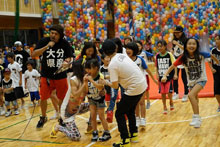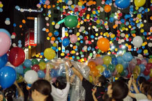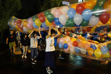 台風接近による雨にもかかわらず、1日の府内戦紙につづき、2日に開催された「七夕ブロードウェイ2014」(大分青年会議所主催)には、延べ約50人の学生が参加しました。この日は雨だったため、風船リリース以外の催しが荷揚町小学校体育館で実施されました。そんな中、学生たちも14時から荷揚町小学校体育館に集まり、1万個の風船をつくりました。20時30分から「48万人の広場」にチューブにいれた風船を持って移動、集まった市民や子どもたちに風船を配り、風船リリースに備えました。