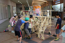 8月6日、本学 人文棟エレベーターホールにて「アートスネーク制作ワークショップ」を行いました。午前中、胴体の竹骨組み作りを行い、午後は一般の方々や愛光保育園学童保育の小学生みなさんが参加して、胴体に紙を貼ってハート型の鱗や模様をはって、胴体部を完成させました。昼食は、収穫のお手伝いをさせていただいた大分市野津原岩下地区のクチナシの実を使ったパエリアを羽釜で炊いてみんなでいただきました。夏休み期間中とあって日頃静かな学内も、この日は子どもたちの元気な声が響いていました。