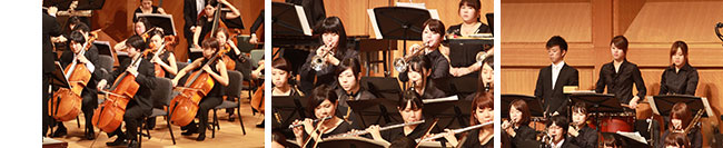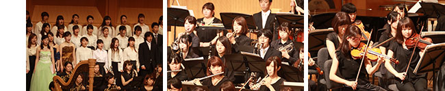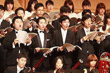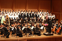 1曲目は、ハイドン作曲のオラトリオ「天地創造」。旧約聖書を基に書き上げた壮大なスケールの曲で、合唱と共にソプラノ、テノール、バスの声楽ソロが活躍します。今回は、学内オーディションで選ばれた学生が務め、張りのある瑞々しい歌声を響かせました。続いて、混声合唱のためのカンタータ「土の歌」(佐藤眞作曲)。特に、最終楽章の「大地讃頌」は有名で、中学校でもお馴染みの曲です。今回は、オーケストラの伴奏による全曲演奏で、原詩に込められた原子爆弾の悲惨さ、平和への希求、そして自然への感謝が見事に描きあげられました。会場からも感動の大きな拍手をいただきました。