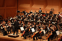 後半は、オーケストラによる演奏で、アメリカの作品が取り上げられました。これは、多くの学生がいる打楽器が活躍できる曲、昨年から学生募集が始まったサキソフォーンが加わった曲ということでの選曲です。3曲目は、映画にもなった「ウエストサイド物語」から組み上げた「シンフォニックダンス」。打楽器が小気味のよいアクセントを叩き出し、オーケストラも躍動し、指を鳴らし、掛け声まで飛び出し、会場が乗りました。