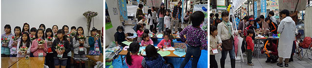 時計屋さん、宅配便、新聞記者、ファッションショーなど、さまざまな仕事に子どもたちがチャレンジしました。本学学生は、ケーキ屋さん、フラワーアレンジメント、ジュース屋さんなどを手伝いました。また、ガレリア竹町にて「アートスネイク制作ワークショップ」も行いました。
