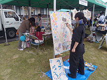 3年ぶりに晴天の中行われた直入地区の地域振興祭。幼稚園、小学校、中学校のそれぞれのステージ発表や出し物が行われる中、竹田キャンパスとしては、エコバック作りのワークショップと、かいゆきによるライブペイントの参加をしました。